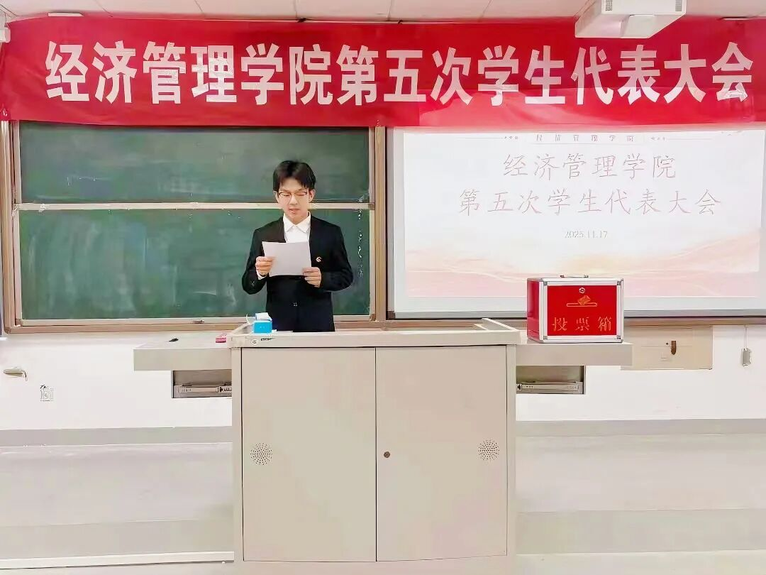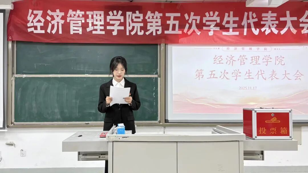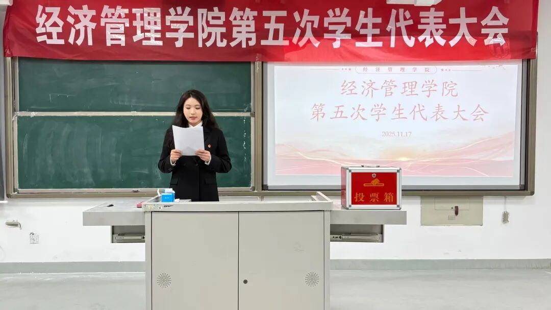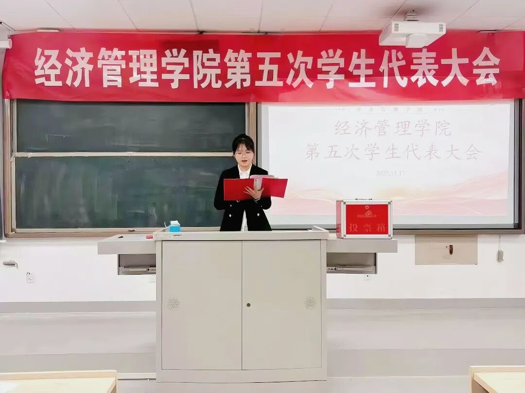 2025年11月17日,经济管理学院在E-3-208教室举办第五次学生代表大会,我院党总支副书记朱燕芝参加了本次大会,会议由2024级知识产权专业一班贾靖敏同学主持。