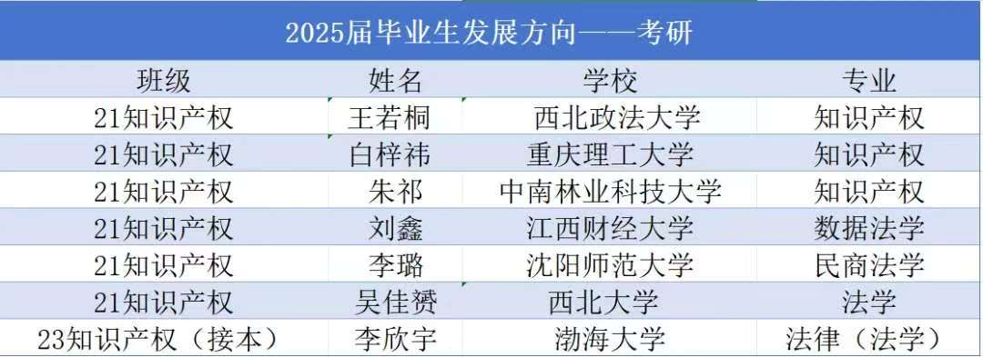 专业学生可在法学、法律(法学)、民商法学、经济法学、知识产权法、知识产权管理等专业方向继续攻读研究生深造。