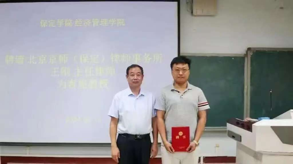 由经济管理学院党总支书记兼院长唐新格为北京京师(保定)律师事务所王刚主任颁发客座教授证书,正式聘请其为学院客座教授。