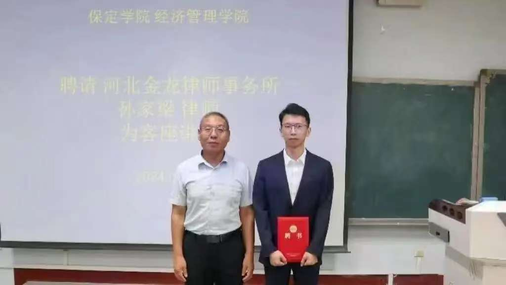 由经济管理学院副院长张鸷远为河北金龙律师事务所孙家梁律师颁发客座讲师证书,正式聘请其为学院客座讲师。